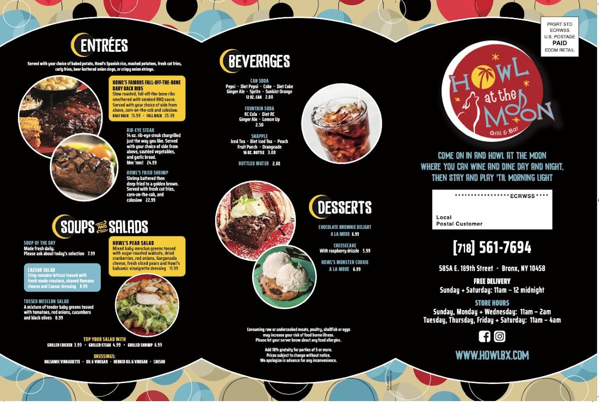 Welcome to Howl At The Moon Grill & Bar, a vibrant dining destination located in the heart of the Bronx. Here, the atmosphere combines a chill lounge vibe with the excitement of sports, making it the perfect spot for a casual outing with friends or a romantic dinner.